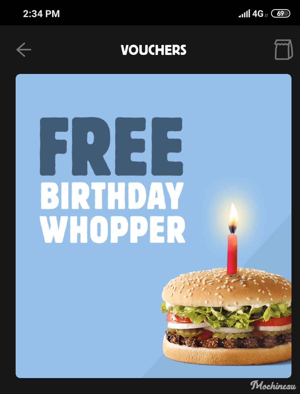 How : Download app Hungry Jack’s, edit profile dan masukkan tanggal ulang tahun. Voucher free whopper burger akan dikirimkan di aplikasi pada bagian voucher.